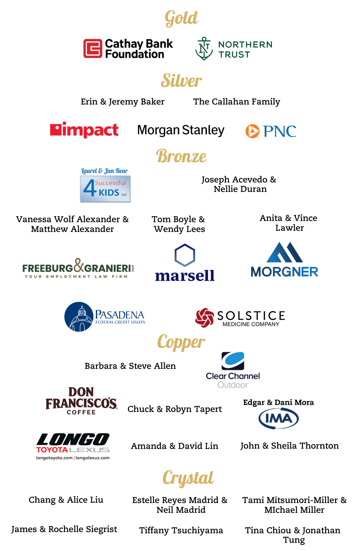 | Recognition on Gala Webpage | Top billing logo/name placement | Top billing logo/name placement | Top billing logo/name placement | Logo/name placement | Logo/name placement | Name | Name |